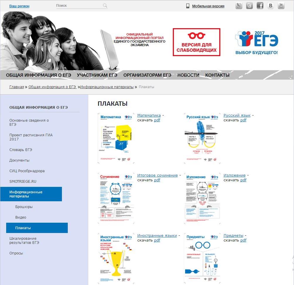 Темы плакатов – сдача русского языка, математики, иностранных языков, правила подачи апелляции, правила поведения в пункте проведения экзаменов и др. Каждый плакат выполнен в цветном формате .pdf (с возможность просмотра на экране), и доступен для свободного скачивания на порталах ЕГЭ и ГИА-9 в разделе «Информационные материалы».