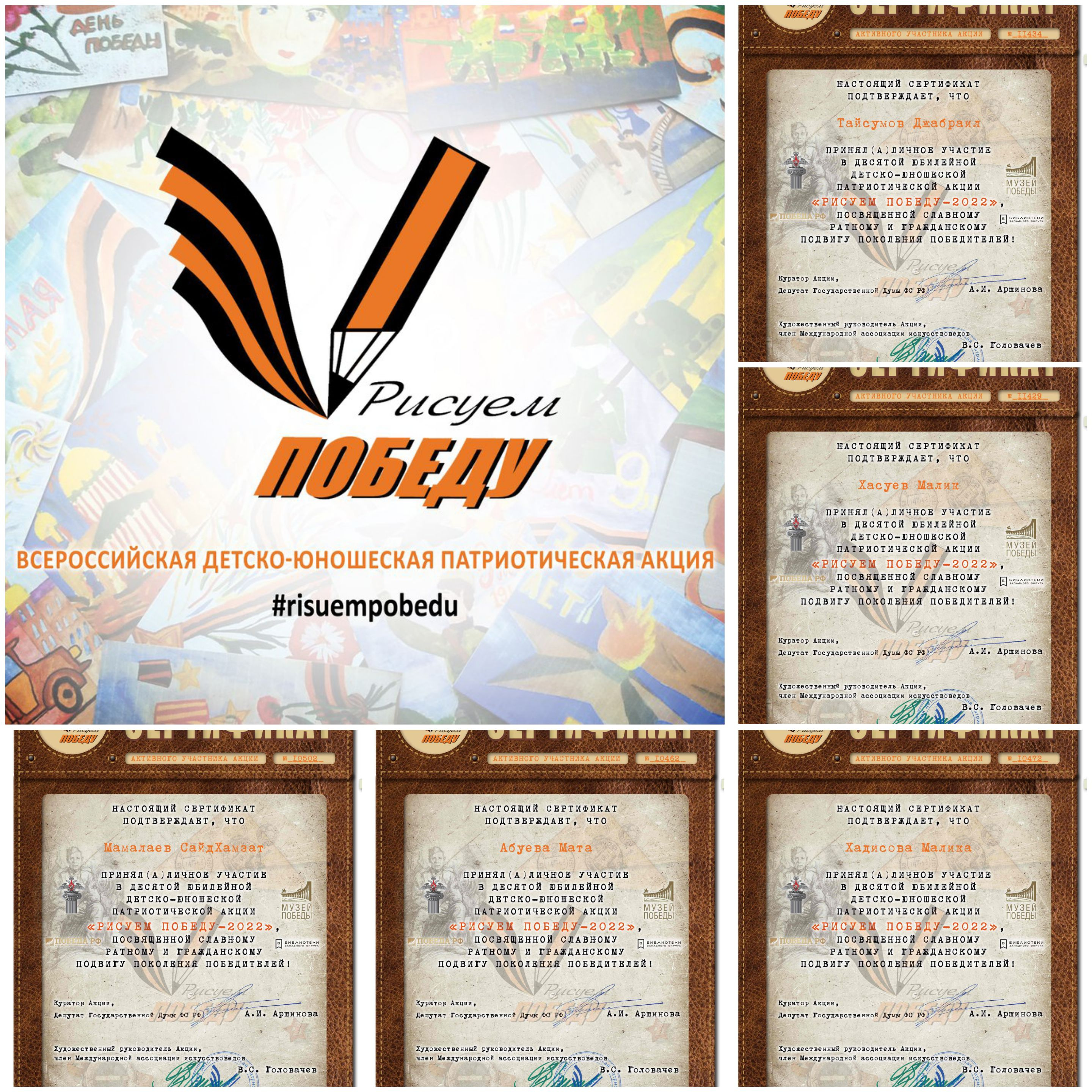 Старт акции дан 23 февраля, в День защитника Отчества. "Рисуем Победу" проводится с целью формирования и развития у детей и молодежи чувства патриотизма, национального самосознания и сопричастности к беспримерному подвигу советского народа на основе услышанного и осознанного исторического материала. Учащиеся нашей школы принимают самое активное участие. Каждый участник получил на память именной сертификат.